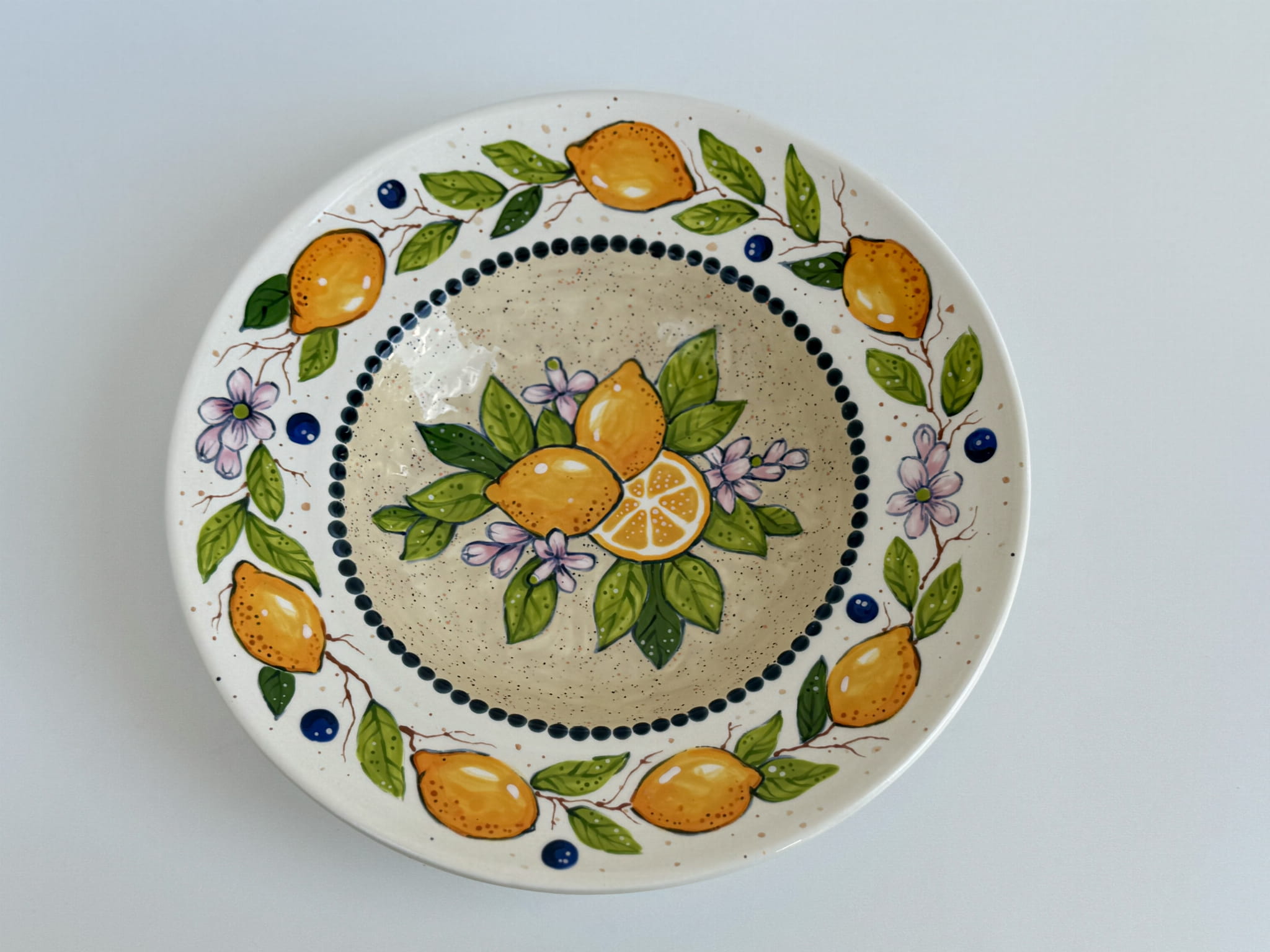 Ręcznie malowany talerz dekoracyjny (beżowy) – Cytryny