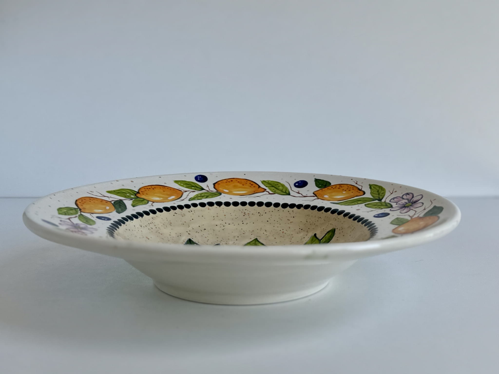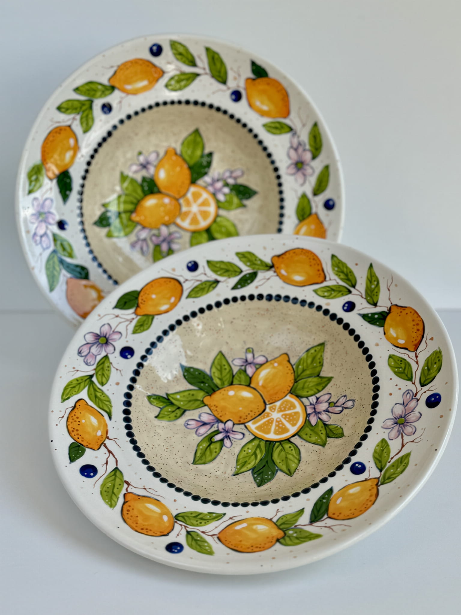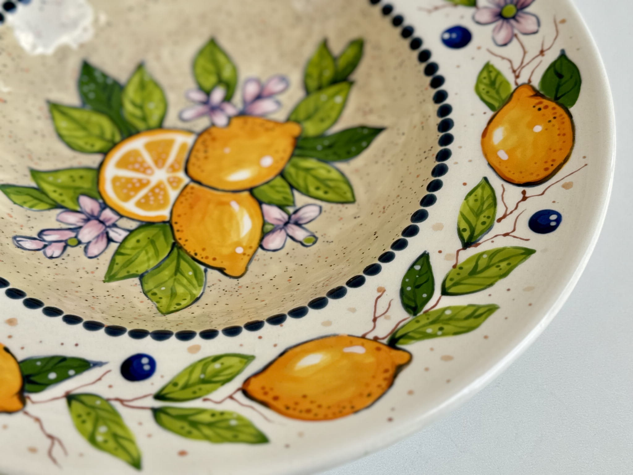 Zdobiony motywami cytryn i kwiatów, talerz zachwyca intensywnymi kolorami i artystycznym wykończeniem, które sprawiają, że każdy egzemplarz jest unikalnym dziełem sztuki.