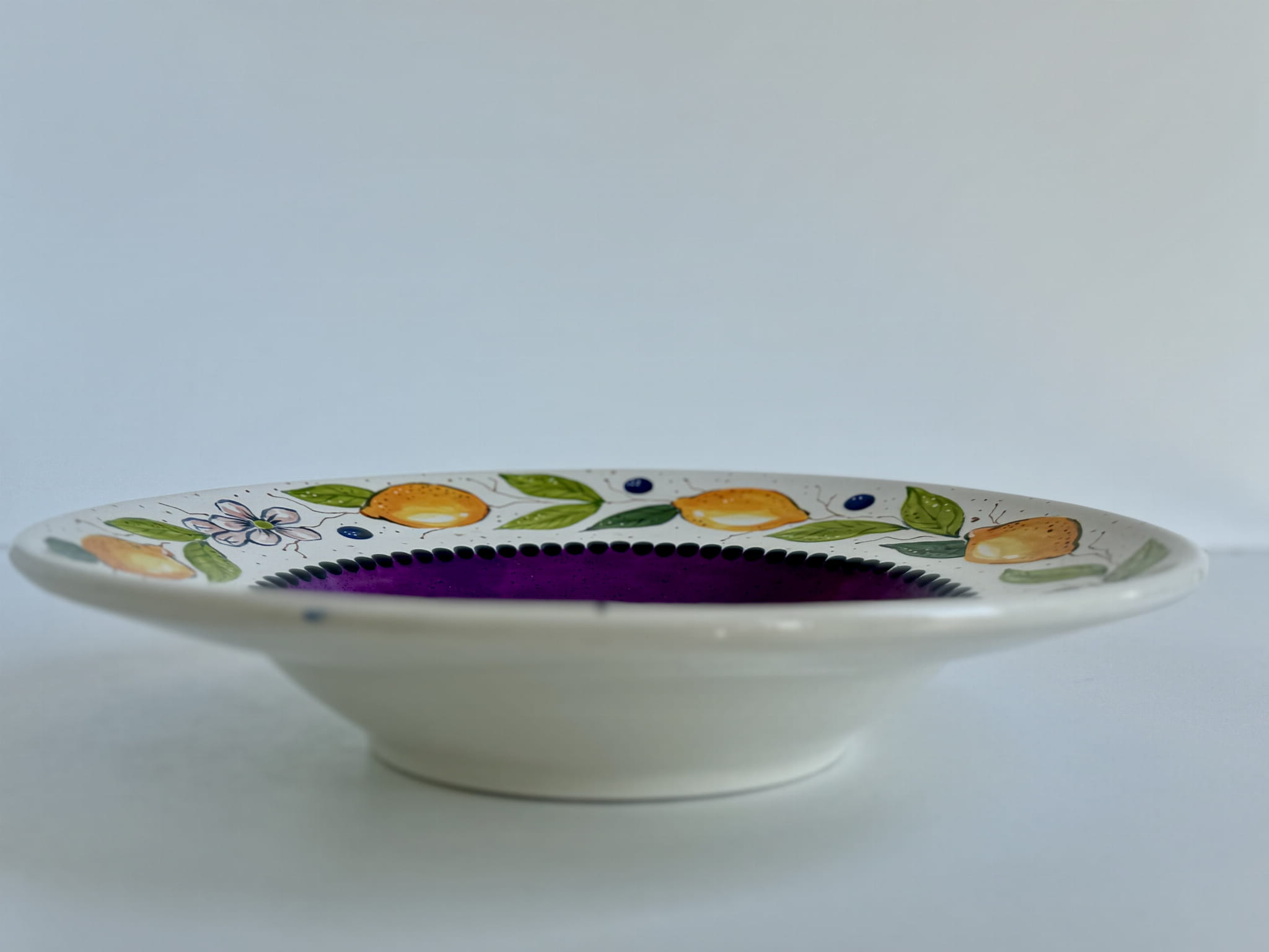 Zdobiony motywami cytryn i kwiatów, talerz zachwyca intensywnymi kolorami i artystycznym wykończeniem, które sprawiają, że każdy egzemplarz jest unikalnym dziełem sztuki.